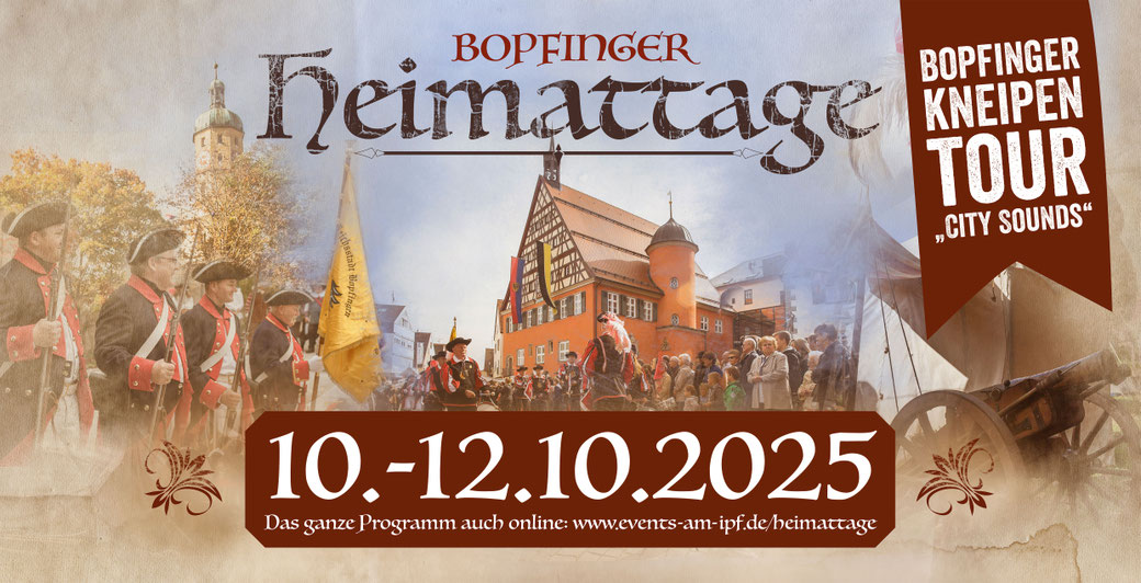 Musik in den Ohren spielt eine zentrale Rolle bei den Heimattagen. Bei Musikveranstaltungen sind täglich Bands, Gruppen und Chöre in den Schänken, Wirtshäusern und auf den Gassen aktiv. Die achte Bopfinger Kneipentour CITY SOUNDS stellt am Samstagabend den musikalischen Höhepunkt dar.