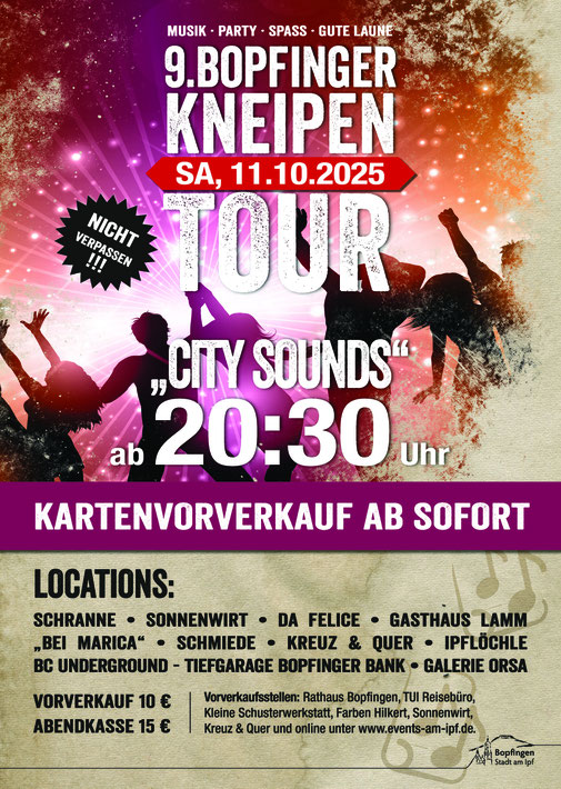 Musik in den Ohren spielt eine zentrale Rolle bei den Heimattagen. Bei Musikveranstaltungen sind täglich Bands, Gruppen und Chöre in den Schänken, Wirtshäusern und auf den Gassen aktiv. Die achte Bopfinger Kneipentour CITY SOUNDS stellt am Samstagabend den musikalischen Höhepunkt dar. Hierzu folgen bald mehr Infos.